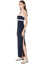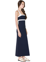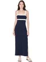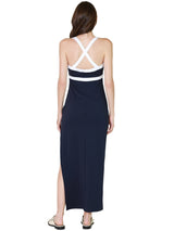 Meet Augustine, a ponte midi dress with contrast binding and criss-cross back straps. This style has a leg slit on the left and hidden side zipper closure.