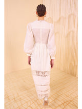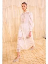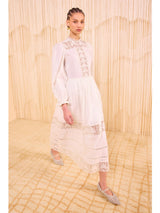 The Amelie Dress draws inspiration from Victorian styles, crafted from pristine cotton dobby with dotted stripes and engineered throughout with intricate lace panels. This white dress has a high, ruffle-trimmed neckline and is imbued with romantic volume in the long sleeves and midi hemline. It has elastic cuffs and fastens with a concealed back zipper.