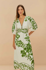 Embrace effortless elegance with the Off-White Green Floral Cascade LENZING™ ECOVERO™ Euroflax™ Midi Dress. Crafted from responsible materials, this piece features a striking V neckline and romantic puffed sleeves. The vivid green floral pattern stands out against a soft off-white backdrop, while the cinched waist adds an alluring silhouette. Perfect for any occasion