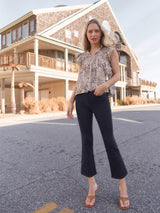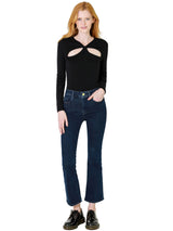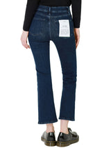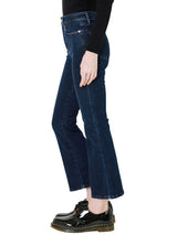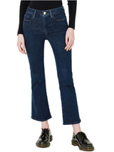 Le One Crop Mini Boot is our best-selling, sustainably made cropped mini boot-cut jean. Made with FRAME’s revolutionary sustainable stretch fabric, this jean spans sizes to deliver perfect fit—even when you are up or down a size. The dark blue Keller wash and cropped fit look chic with heeled booties and laidback with sneakers.
