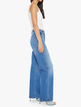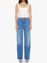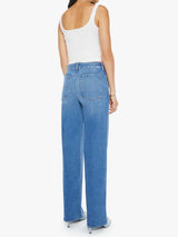 On your mark. High-waisted jeans with a wide straight-leg, slit pockets, a long 32-inch inseam and a clean hem. Made from stretch denim, Ready, Set, Go! is a mid-blue with subtle whiskering and fading at the knees.