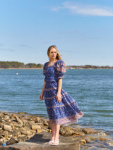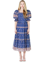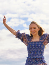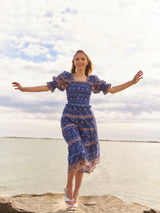 The Rosita border print smocked dress features puff sleeves, smocked bodice and square neckline.