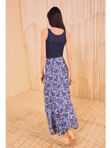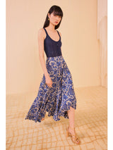 The Sabinia Skirt breathes with movement, crafted from softly striped cotton with graphic botanicals inspired by a vintage indigo panel. Designed to sit on the waist, this multicolored skirt has a wrap-effect silhouette that releases into billowing volume at the midi hemline. It fastens with a concealed side zipper.